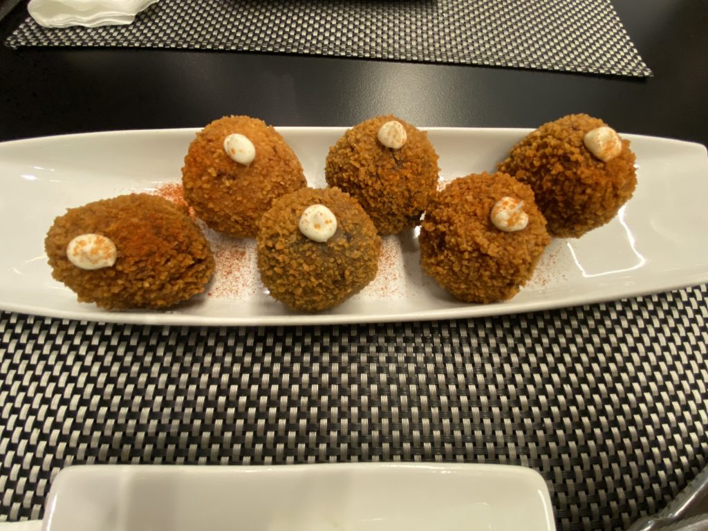 En Alcañiz comimos en el Rokelin, croquetas de chistorra, morcilla, ensalada de jamón y espárragos, entrecot y lagarto con salsa de mango, entre otros, pudimos degustar con un buen vino blanco.
