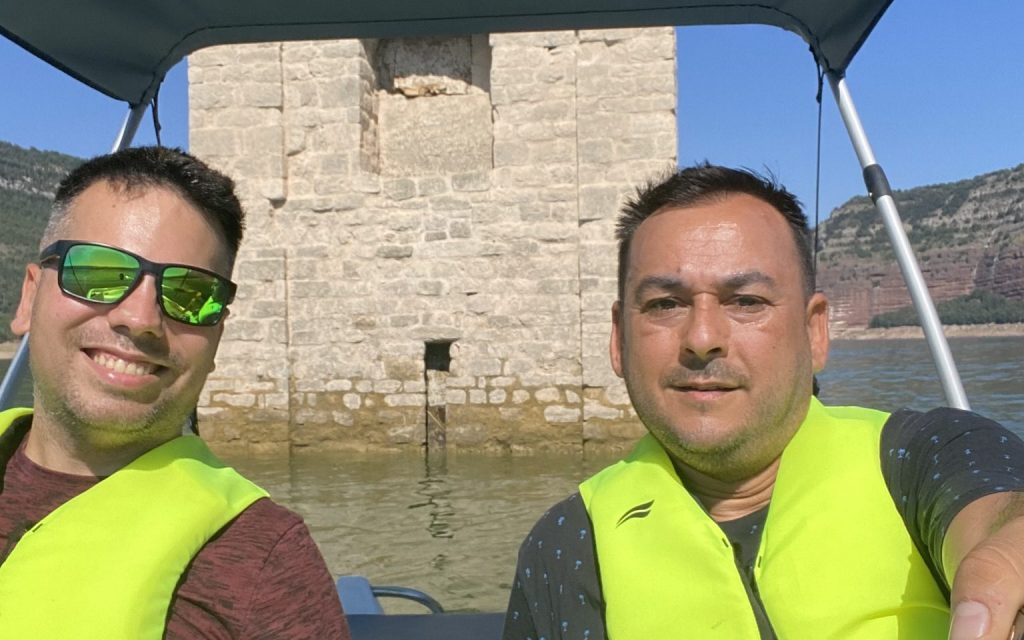 En el pantano de Sau cogimos un barca de pedales y navegamos por encima de las ruinas del antiguo pueblo de Sant Romà de Sau, donde parte del campanario ya estaba por encima de la superficie del agua. Según nos explicaron este 2022 está previsto que debido a la sequía emerja todas las ruinas debido a la bajada del caudal del agua.