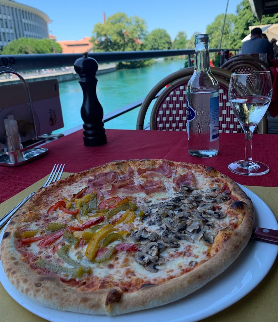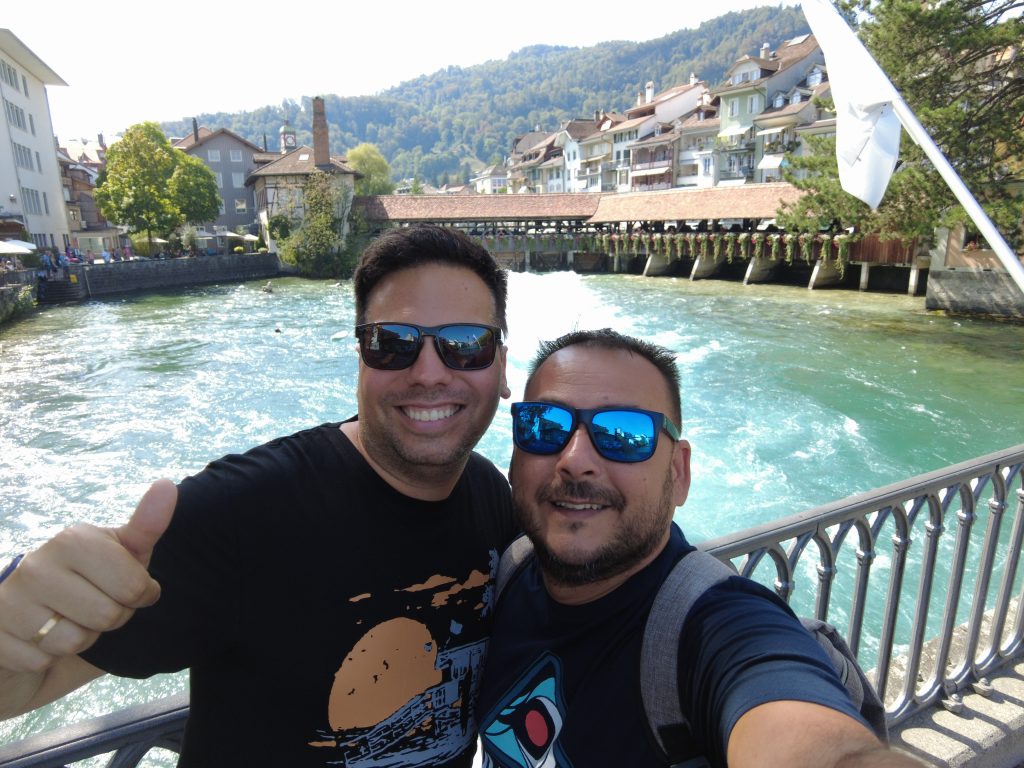 Tanto tiempo paseando nos a dado un poco de hambre y nos sentamos a comer en el Restaurante La Perla, en una terracita con vistas al rio Aare, unas ensaladas, una pizza y pechuga de pollo con piña y risotto son los riquísimos platos que degustamos relajados en la terraza. El precio es de unos 63 francos.
